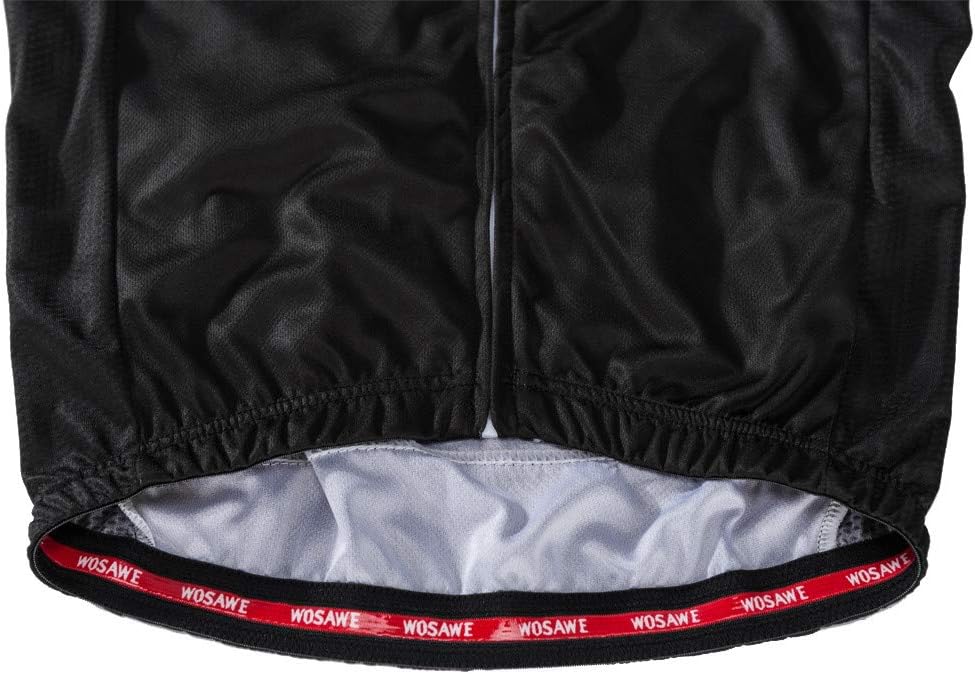 A barra da camisa possui acabamento em elástico de silicone com o logo WOSAWE repetido, garantindo que a peça permaneça no lugar sem subir durante os movimentos do pedal. O forro interno em tecido claro proporciona conforto adicional.